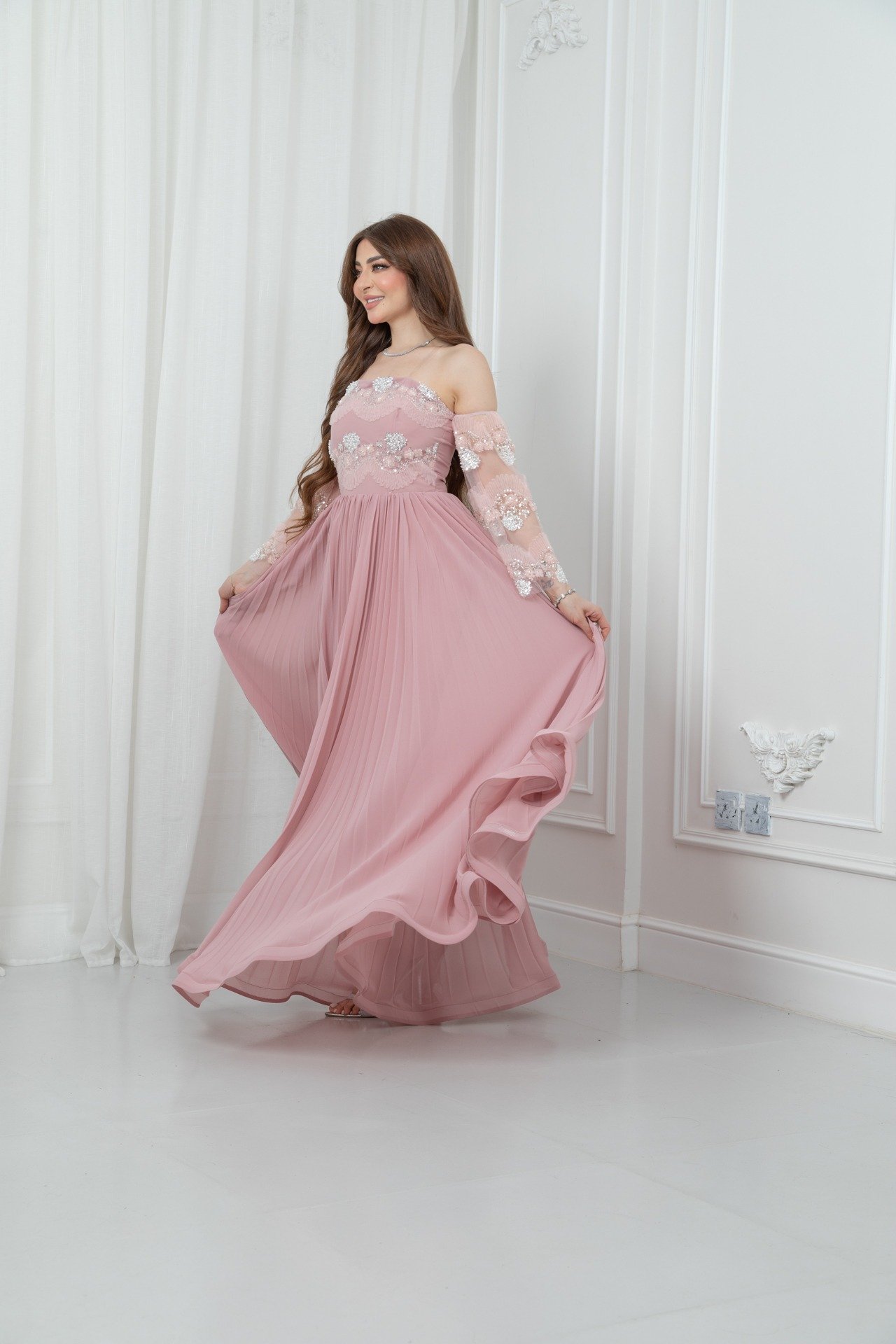 فستان شيفون وردي بتطريز بليسيه أنيق