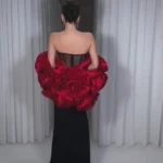 فستان سهرة أسود من كريب ضيّق مع جاكيت ورود شانطون أحمر، تصميم كورسيه عصري وجاكيت منفصل بتفاصيل درامية، مثالي للمناسبات الفاخرة.
