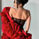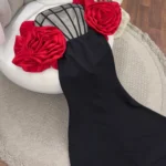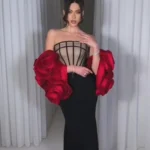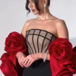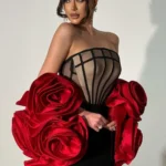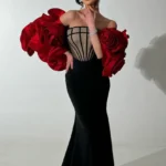 فستان أسود أنيق يخطف الأنظار بقصّته الجذابة وتصميمه الجريء. يأتي بقصة ضيّقة تبرز تناسق القوام، مع كورسيه شفاف بلون الجلد مزين بخطوط سوداء تمنح تباينًا عصريًا مثيرًا. ما يميّز هذا التصميم هو الجاكيت المنفصل المصنوع من قماش الشانطون الأحمر، والمزين بورود ثلاثية الأبعاد ضخمة تنسدل على الذراعين بأسلوب درامي يخطف الأضواء. إطلالة متكاملة بين الجرأة والفنّ، لتكوني محور الانتباه في أي مناسبة.