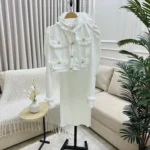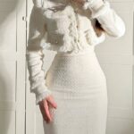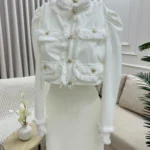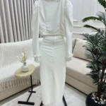 طقم أنثوي أنيق يتكوّن من تنورة ضيقة بخصر عالٍ مصنوعة من قماش مطاطي بلون سكري ناعم، تنسدل بانسيابية وتبرز القوام بانحناءات ناعمة ومريحة. يُرافقها جاكيت قصير بخامة ثابتة غير مطاطية، يتميّز بياقة مستقيمة وأزرار أمامية ذهبية لامعة تضيف لمسة فاخرة للتصميم. الأكمام طويلة مع أطراف مشدودة تعزز البنية المحددة للجاكيت، بينما التباين بين الخامتين يمنح الطقم توازنًا بصريًا رائعًا يجمع بين الراحة والأناقة.