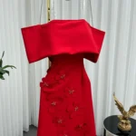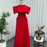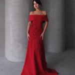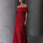 فستان ناعم طويل بلون أحمر جذاب، يتميز بقصّة أوف شولدر تبرز منطقة الكتفين بطريقة راقية.