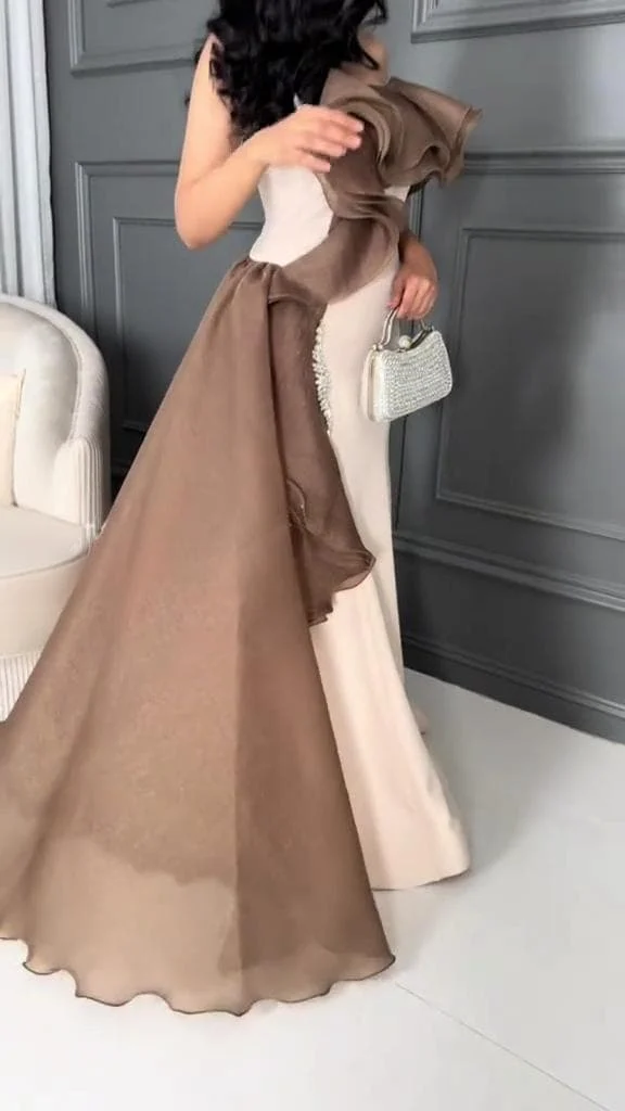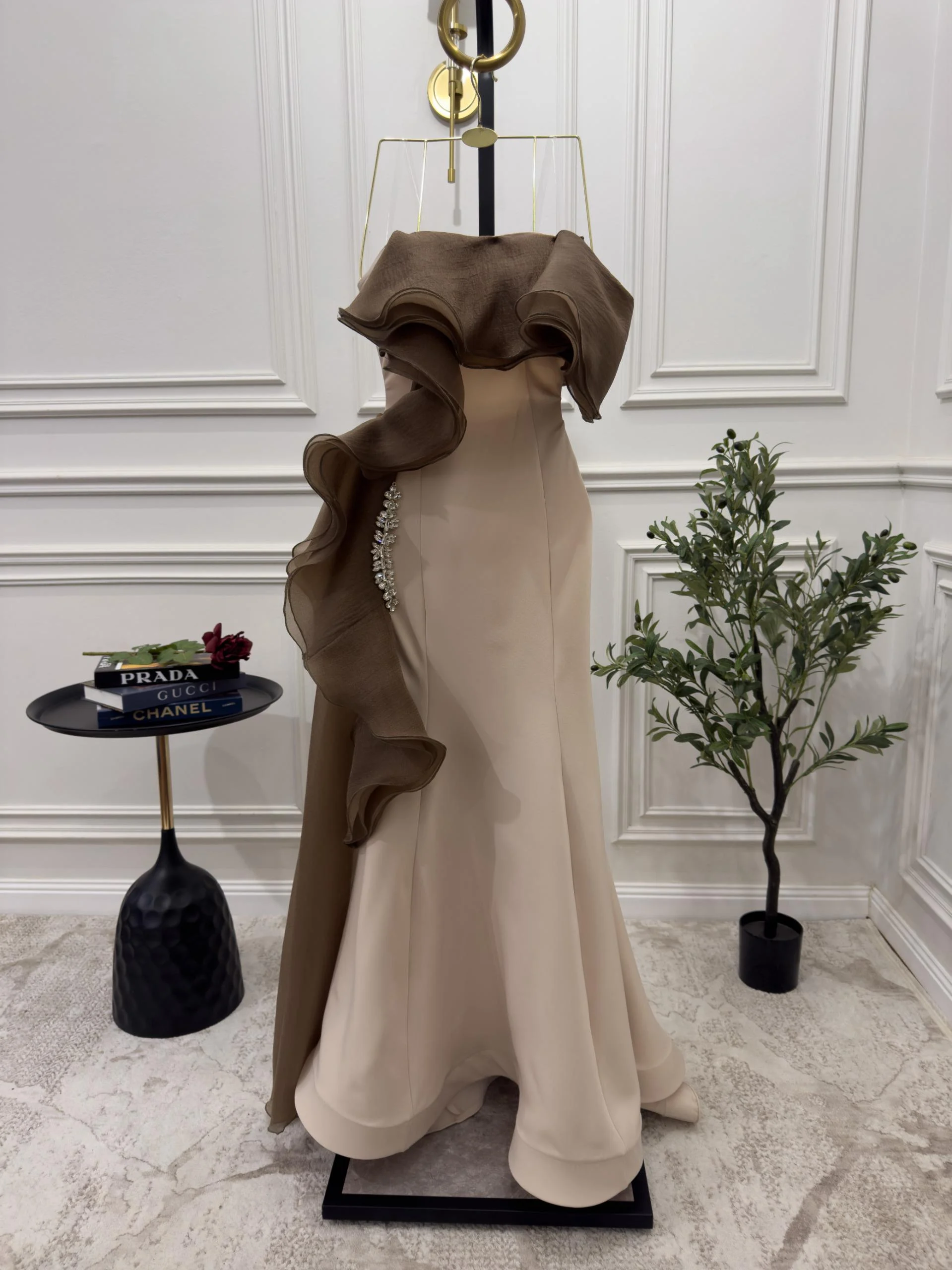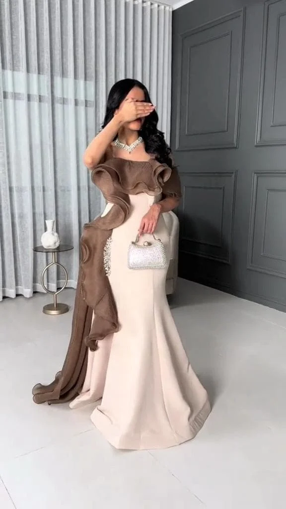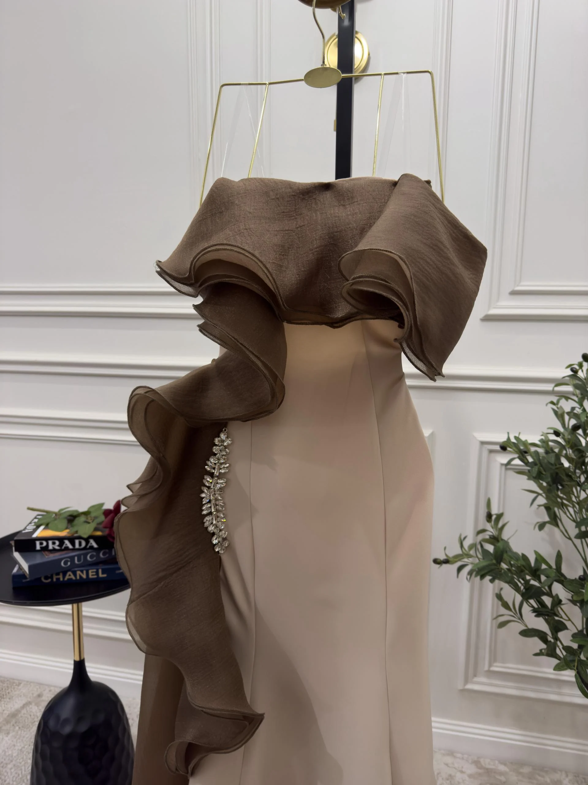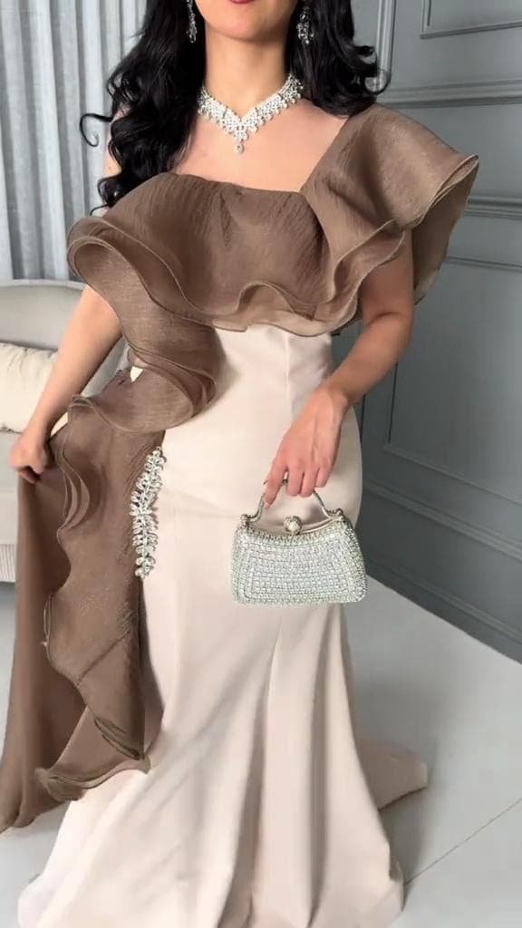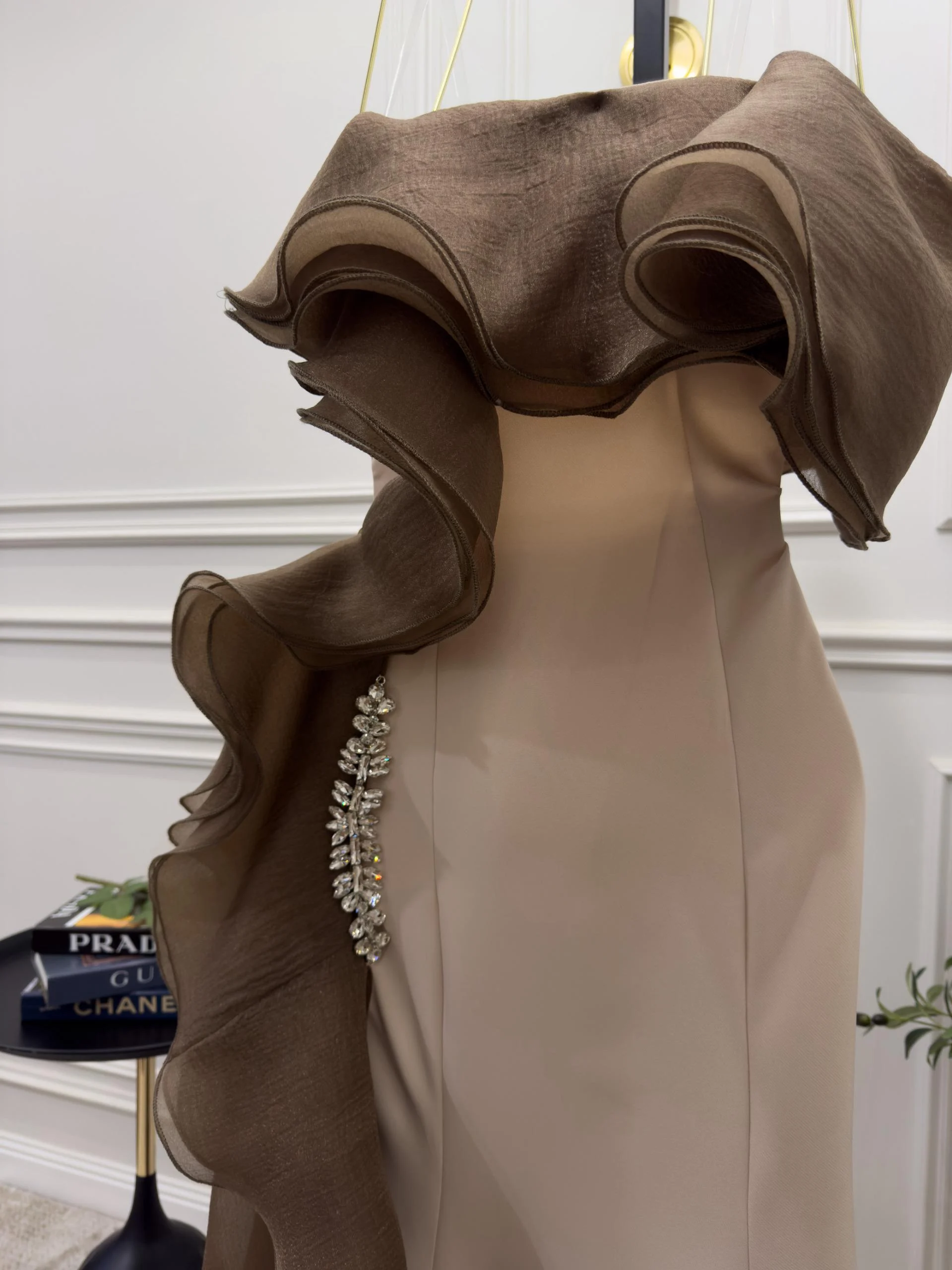 💎 الشال البني الطائر ينسدل بخفة ليُكمل الإطلالة بلمسة ساحرة تشبه نسيم الرياح، مما يمنح التصميم طابعًا شاعريًا لا يُنسى.