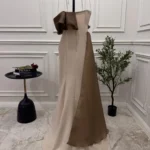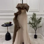 ✨ فستان أنيق يتألق بلون بيج هادئ يعكس الرقي والسكينة، مع قصة متموجة في الجزء العلوي تضيف حيوية وانسيابية ناعمة.