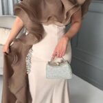 👜 الحقيبة: اختاري كلاتش صغيرة بلون البيج أو البني مع تفاصيل معدنية بسيطة تتناغم مع الشال الطائر.