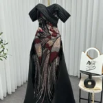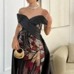 🌹 القصّة بلا أكمام تُبرز القوام بانسيابية ساحرة، بينما مزيج الألوان بين الأسود العميق والروبي والفضي يضفي فخامة لا تُضاهى.