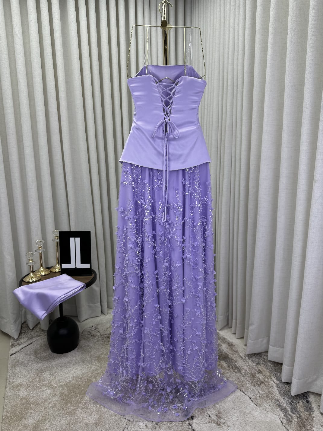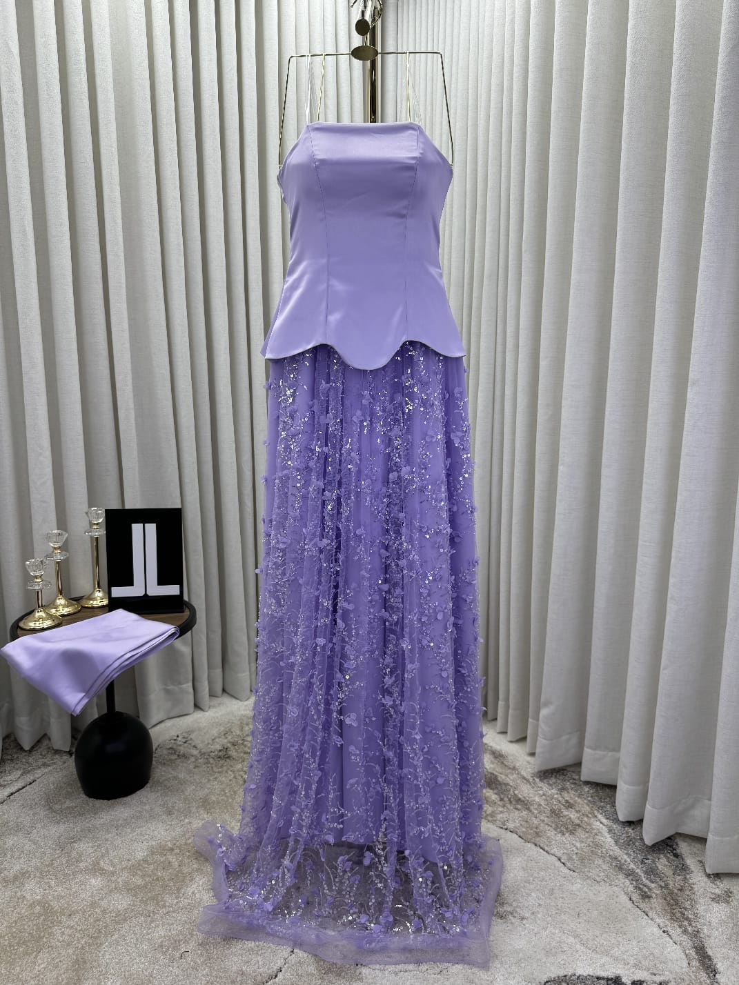 ✨ فستان همس البنفسج ✨ يتميز بأناقة فريدة تجمع بين التفته الناعمة في الجزء العلوي والكلفة الفاخرة في الجزء السفلي، ليخلق توازنًا رائعًا بين الرقة والفخامة.
