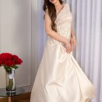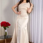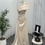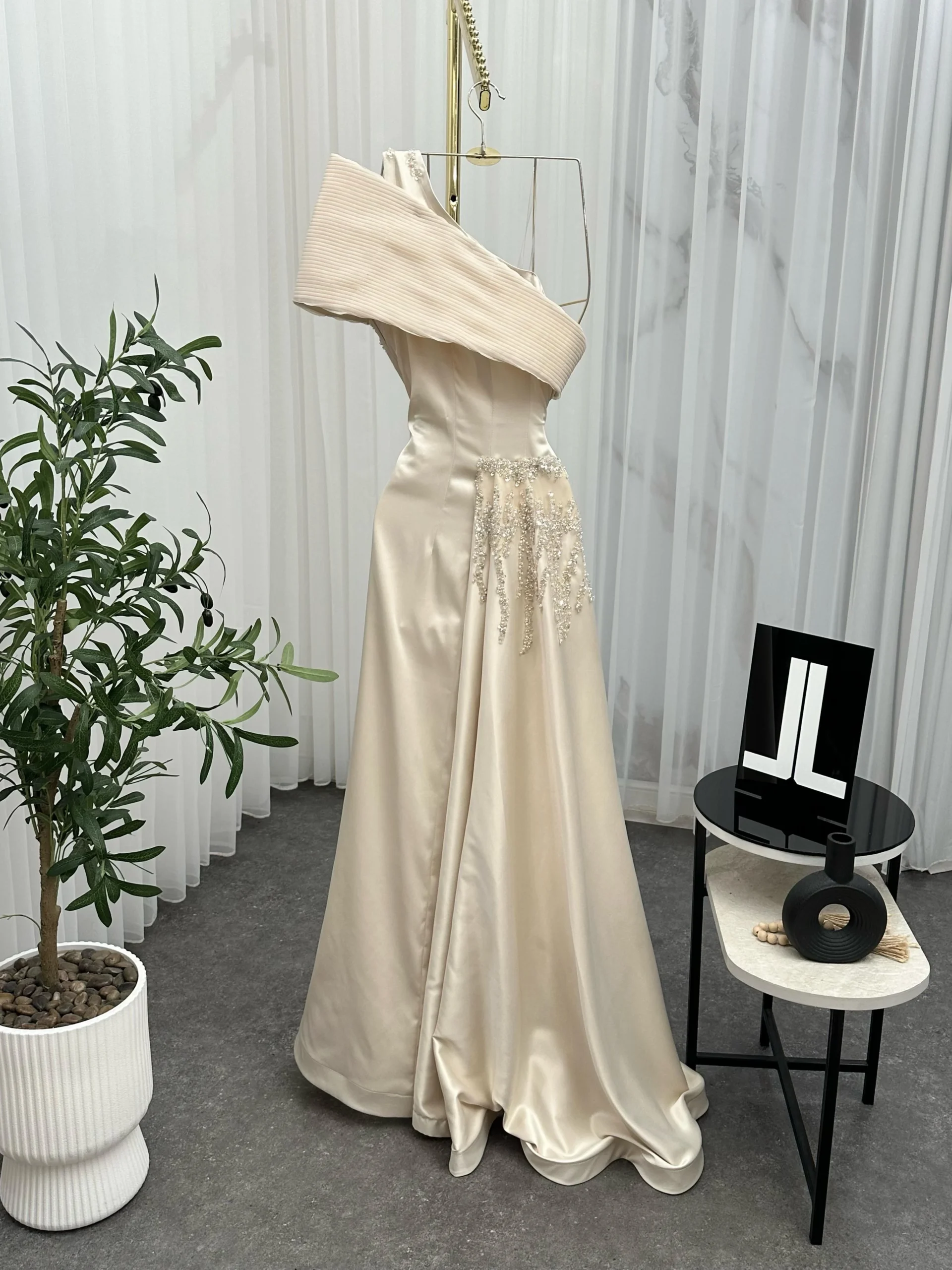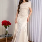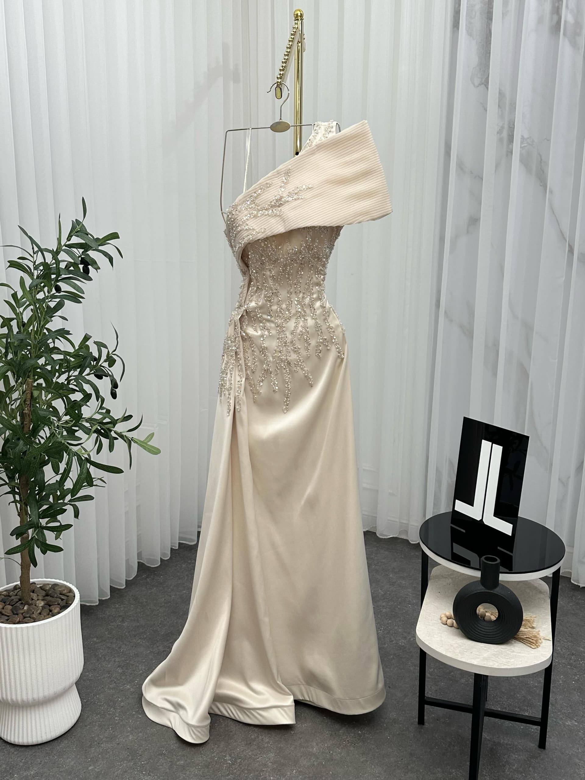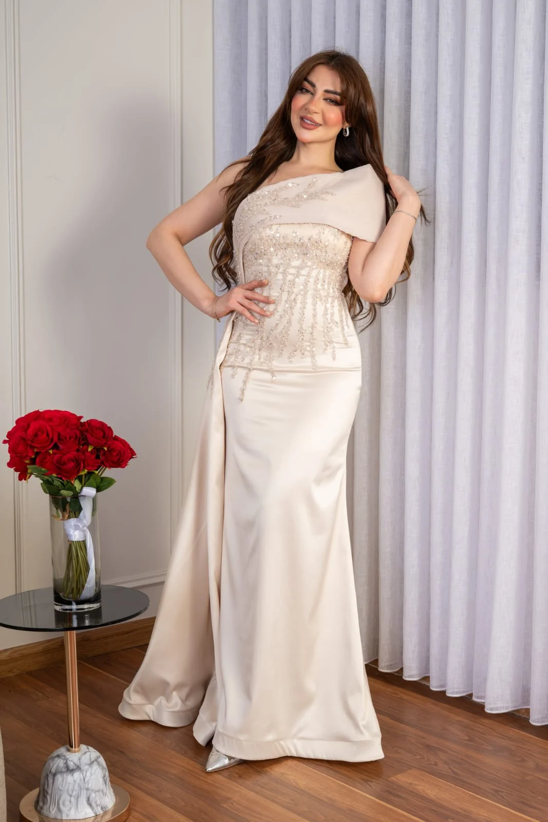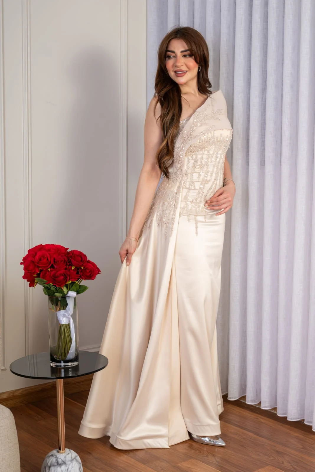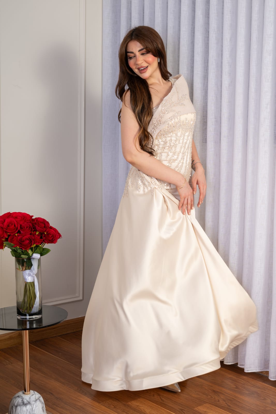 فستان سهرة طويل وفخم مصنوع من تفته السهرة الفاخر بلون الشامبانيا، يضفي إشراقة راقية تحت الإضاءة. يبرز التصميم بتفاصيل متقنة، حيث تتناغم زخارف اللؤلؤ والترتر اللامع على الصدر لتكوّن وميضًا ناعمًا يعبّر عن الأناقة الملكية. قصة الفستان ناعمة وتحتضن القوام بانسيابية ساحرة، بينما يأتي الكتف البليسيه ليمنح حضورًا مميزًا في المناسبات الرسمية والسهرات الفاخرة.